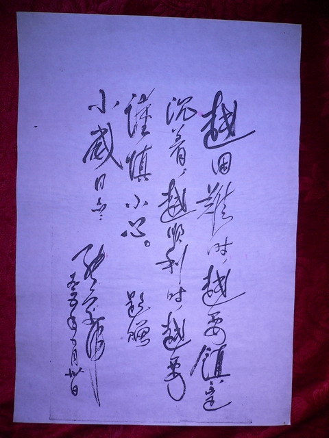 六六年文化大革命开始了,抄家风在全国蔓延,二姨夫被批斗,消息传来,我非常着急,想到这题词决不能被抄走,立即把它夹在报纸中间,放在箱底当垫纸用,那时我已经是大学生了,大学的造反派极左,对我们这些稍有“问题”的同学毫不留情,抄家时来个底朝天。可是谁都没想到,那垫底的报纸中夹着我最珍贵的物品,真是有惊无险地逃过了一劫,从此我只把姨夫的话记在心里,而题词从不拿出示人。直到文化大革命结束,社会稳定了,我才用镜框装起来,挂在家里。